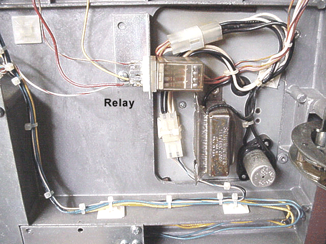 Pictures of Relay Mounted on Door. Note relay mounting locations vary slightly. Some mount a little higher (nearer the small lamps). Also, the relay styles differ slightly. However, they all have one thing in common. One wire from the relay goes to the coil under the coin mechanism.